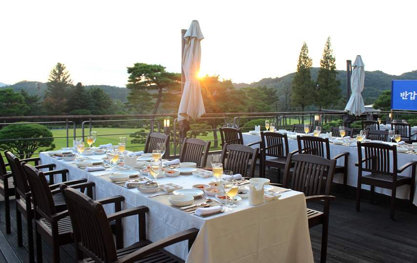 코스의 전경이 한눈에 내려다 보이는 야외 테라스에서