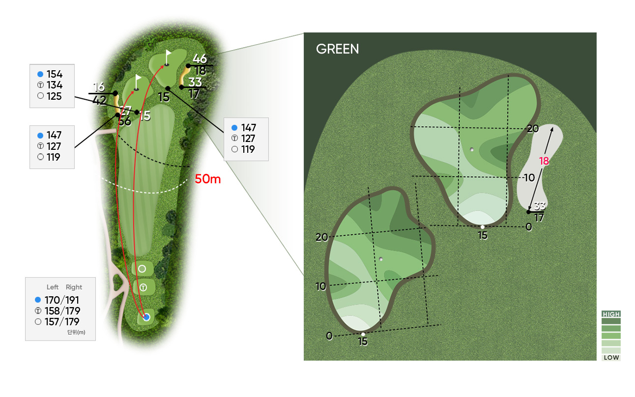 Par 3 / Handicap 7 발아래 펼쳐진 그린은 다소 가까이 느껴지나 풍향에 따라 거리측정이 어려운 홀이다. 바람의 장난이 모든 감정을 깨워나게 한다.| 구분 | 1홀 | 2홀 | 3홀 | 4홀 | 5홀 | 6홀 | 7홀 | 8홀 | 9홀 | 합계 |